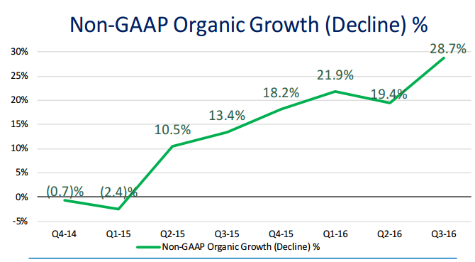 So what: Looking at the top and bottom lines, investors were clearly happy with both results. The company's revenue checked in at $664.6 million during the fiscal 2016 third quarter compared to analysts' estimates of about $598 million. That solid top-line growth filtered down to the bottom line, too.