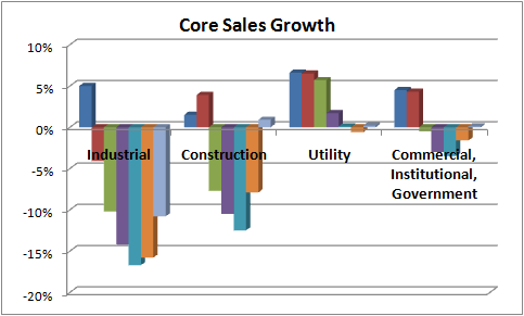 However, the good news is that the other three segments, namely construction (33%), utility (16%), and commercial, institutional and government (14%), or CIG, all generated organic and core sales growth in the quarter. As you can see below, it was a return to core sales growth for the construction end market.