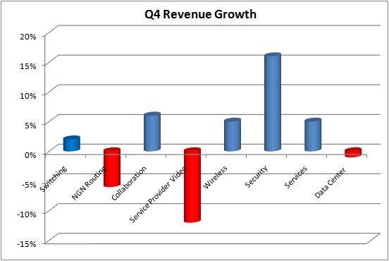 Meanwhile, a breakout of revenue growth in the most recent quarter shows how non-core areas like wireless, collaboration, and security generated good growth. In addition, Cisco continued its good run with services growth. It came in at 5% following a normalized growth rate of 4% in the third quarter, and 3% and 1% in the previous quarters.