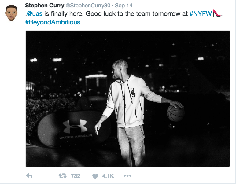 Where the brands will converge, however, is who promotes them. I asked Pruess if Under Armour plans for other celebrity endorsements outside of its athletes (such as the music artists and other celebrities that have been tapped for brands like Adidas and Skechers recently). He said that Under Armour's athletes have been some of the biggest proponents of stylish clothes to wear off the field, and they will be the ones promoting the line. NBA MVP Steph Curry posted a picture on Twitter the day before the event wearing UAS gear.