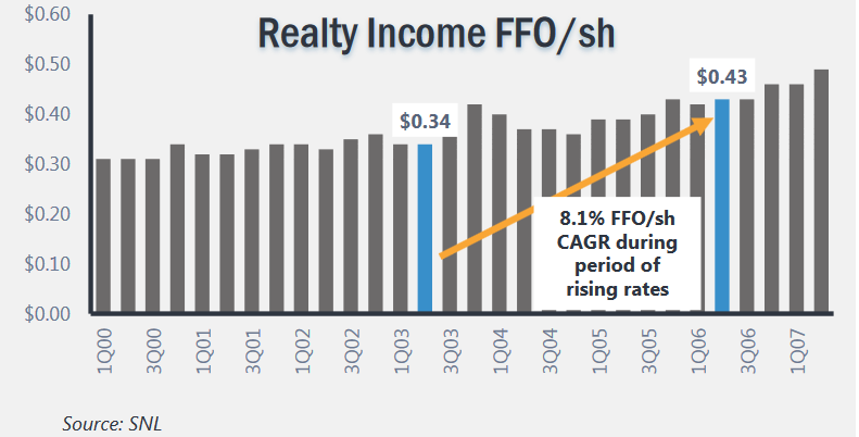 10. Little interest rate sensitivity -- A lot of REITs are sensitive to rising interest rates, which is a legitimate possibility over the next several years. Not only do rising rates make it more expensive to borrow money, but higher interest rates also make other income investments more appealing to investors, creating downward pressure on the stock prices. And, while Realty Income's stock price may indeed take a hit when rates rise, any weakness is likely to be short-lived. After all, during the last period of rising rates (2003-2006), Realty Income thrived, growing FFO per share at an 8% annualized rate.