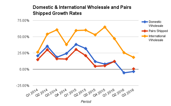 The falloff in growth in domestic wholesale repeated its gut-wrenching drop in the first quarter: Growth rose just 12% this time, for a 68% drop in the growth rate, until finally turning negative in the second quarter when sales actually fell 5.4% from 2015. That it's negative once again in the third quarter shows just how much this footwear company's business has shriveled.