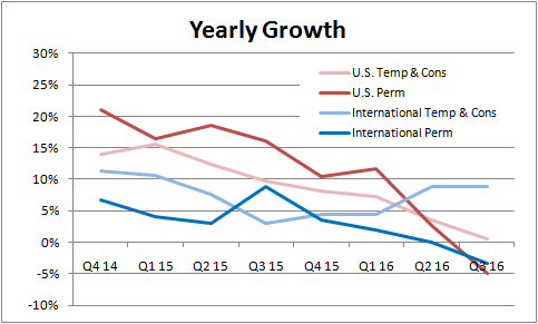 Below, I've broken out the quarterly figures by U.S. and international (temporary and consulting and permanent placements) so that readers can get a good handle on trends.