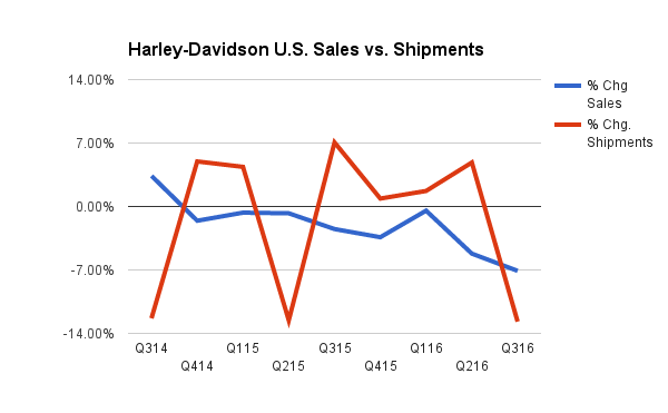 Data source: Harley-Davidson quarterly SEC filings. Chart by author.