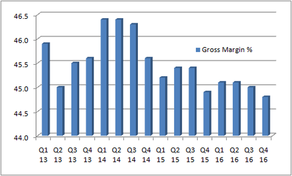Indeed, the shift to large account business (which accounted for 75% of growth in the quarter) has probably negatively impacted gross margin, as has the relatively lower growth in sales from MSC Industrial's core customers. As you can see below, the end result is a decline in gross margin in the quarter.