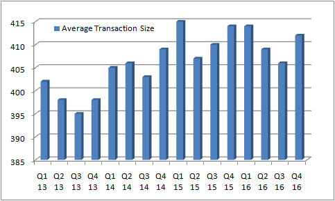 Moreover, a look at average transaction size also suggests stagnation. This is a useful metric because as part of its expansion drive, the company has sought to increase the amount of large national accounts it services.
