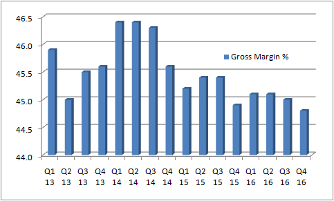 - Gross margin of 44.8% came in toward the lower end of the forecast range of 44.7% to 45.1%.
