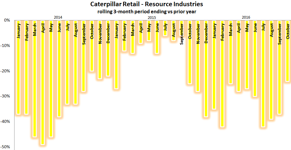 The truth is, Caterpillar's rolling-three-month sales in resource industries -- which revolves around the mining industry -- have plummeted at double-digit rates since late 2015, and they only posted declines of less than 10% in five individual months since 2014. The average decline is a staggering 27%.