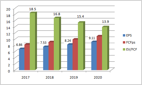 Turning to valuation, the following chart shows you analyst consensus EPS forecasts, and FCF per share assuming a 120% conversion rate, and then the EV/FCF multiple (compare with the second chart above) with the conservative assumption of no share buybacks.