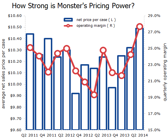 Monster's EPS grew at far higher rates for the first two quarters of 2014 than it has in years, and analysts expect this trend to continue into the third quarter. Some of this is undoubtedly due to the periods against which these quarters are compared -- the first quarter of 2013 saw Monster's only year-over-year EPS decline in this decade, and the second-weakest quarter of the decade came immediately afterward. But a good part of Monster's strengthened earnings can also be explained by better pricing power, as its sales price per 192-ounce equivalent case rose to its highest mark of this decade in the second quarter. That $10.49-per-case sales price translated into decade-high operating margins, which translated in a fairly straightforward way to record-high net margins: