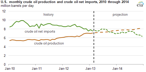The good news is that we are making some progress. Crude oil production in the U.S. continues to climb, which is slowly reducing the amount of oil that's imported. That trend is projected to continue, which, if projections hold, would have the U.S. soon producing more oil than is imported for the first time since 1995. The following chart shows that we're right about even today: