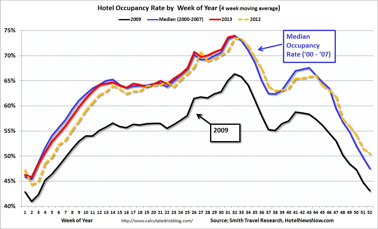 Hotel occupancy is back to pre-recession levels, writes Calculated Risk: