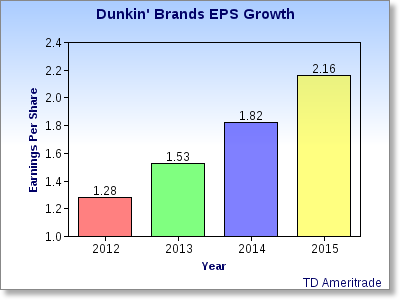 In its second quarter report, Dunkin' projects earnings per share to be between $1.50-$1.53 in 2013, in line with analyst expectations. This growth is not expected to slow up anytime soon either. Take a look at the earnings projections, provided by TD Ameritrade, through 2015: