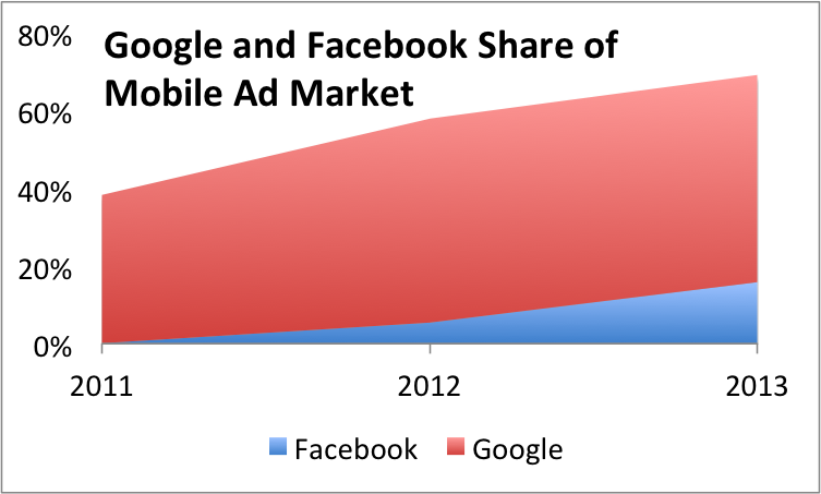 Though Google isn't gaining much in terms of market share, it is in absolute dollar amounts. Google's mobile ad revenue between 2012 and eMarketer's 2013 estimate should increase by about $4.2 billion. eMarketer estimates Facebook's will only increase by about $2.1 billion.