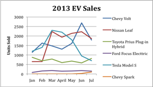 As 2013 has progressed, more EVs -- such as the Chevy Spark -- have become available, and the Volt and Leaf have struggled, while sales of other EVs have climbed. Thanks to the limited market, having more EVs come to market dilutes other EV sales.