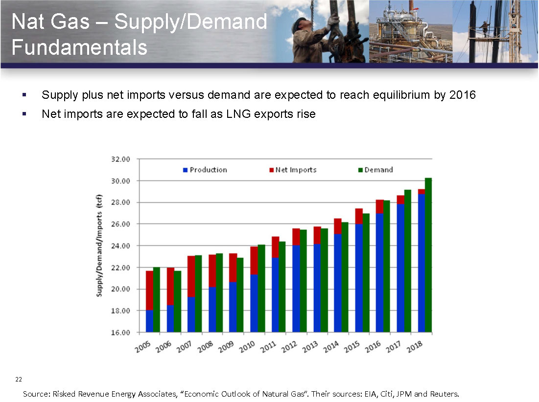 Vanguard's business model is pretty simple. It buys up oil and gas reserves and then locks in the margins of the future production by hedging it for the long term. In its most recent natural gas acquisitions, the company was able to pick up dirt cheap assets that will earn a fair profit on the production over the next few years. However, over the longer term, those assets could turn out to be a real gem as the supply and demand imbalance for natural gas begins to shift. The following slide breaks down those fundamentals: