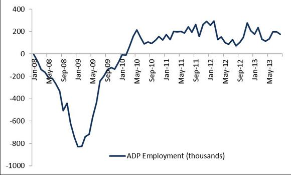 The dog days of summer aren't quite over for employment. Nonfarm private employment increased by a seasonally adjusted 176,000 jobs for August according to ADP's (ADP 0.47%) National Employment Report (link opens in PDF) released today.
