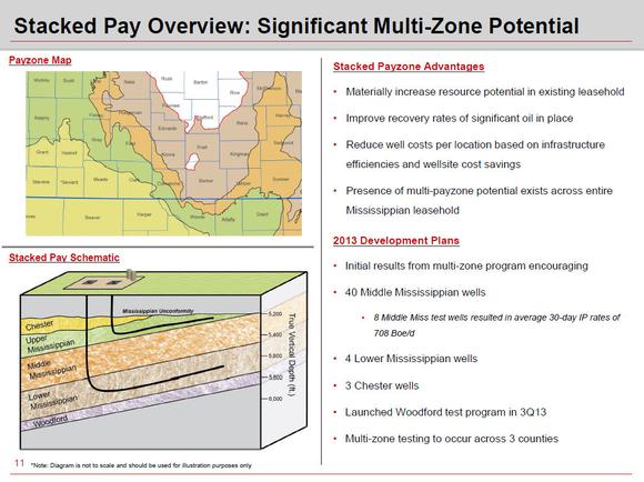 In the slide below from a recent investor presentation, SandRidge lays out the advantages of having these stacked pay zones as well as its current development plans. It also has a nice schematic to visually show what this looks like.