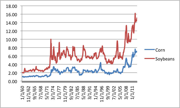 According to this data I collected, the opposite has happened. While the price of corn has increased, the price of soybeans has increased somewhat more, indicating that, absent alternatives for corn like other cellulosic biofuels such as algae, corn prices may still have room to run before being hit by a fundamental downturn.