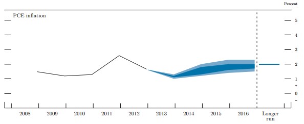 Inflation, a metric that's kept fairly on track throughout the Great Recession and recovery, doesn't look to be starting any problems now. From a 2013 range of 1.1% to 1.2%, rates are expected to edge up to as much as 2% by 2016, the Fed's long-run target amount.