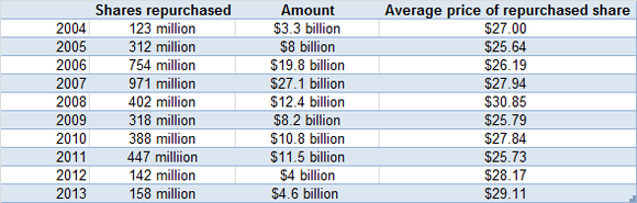 Shares currently trade at around $33, so the average return on investment for Microsoft's repurchase has been fairly low. But, hey, it beats cash in the bank.