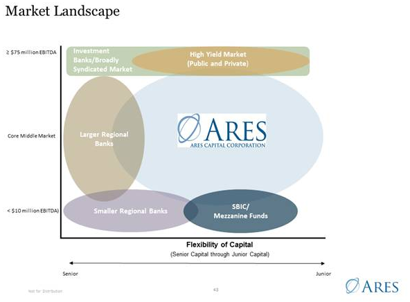 The chart focuses on Ares Capital, but it's fitting for all business development companies. When a company generates more than $75 million in annual earnings before interest, taxes, depreciation, and amortization (EBITDA), it can tap the vast public markets for capital. That's where the investment bankers come into play.