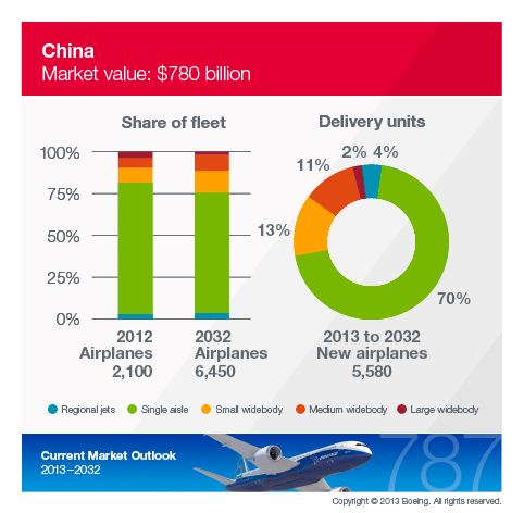 Boeing predicts that Chinese airlines over the next two decades will need nearly 6,000 new airplanes worth $780 billion – tripling the nation's current fleet. For perspective on that growth, consider Boeing's entire revenue this year is expected to range between $83 billion and $86 billion.