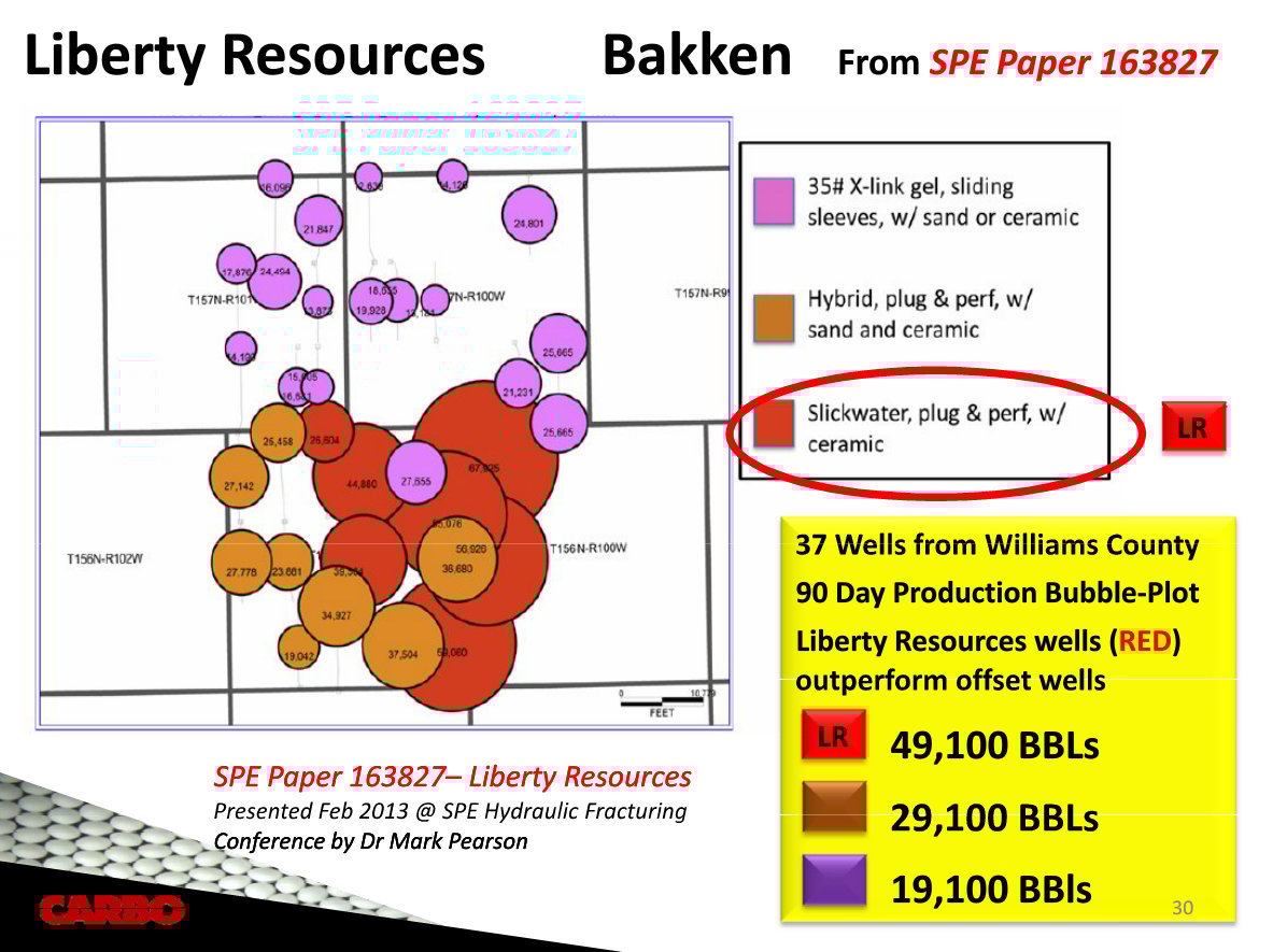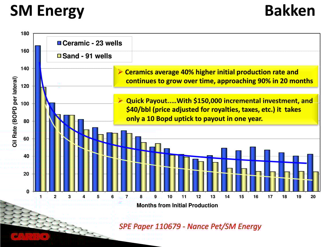 The production of Liberty's wells for the first 90 days was much better than the production of its competitors. By using 100% ceramic proppants, it had found the secret that CARBO and a few others already knew, which is that ceramics are the key to unlocking more oil out of the Bakken. While ceramics cost more up front, the payback is felt both with increased initial production and by boosting the estimated ultimate recoveries of each well.