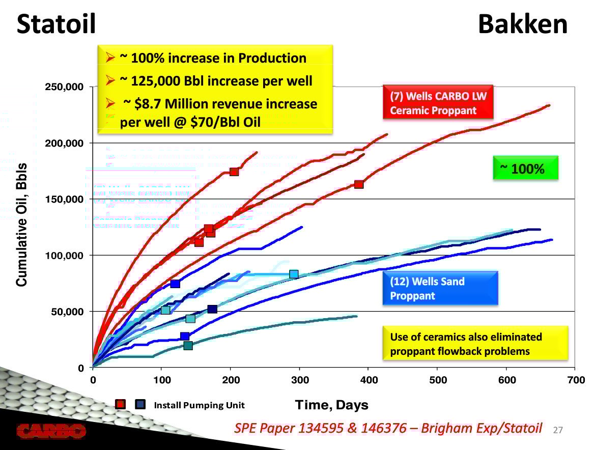 That is compelling data as not one of the wells fracked with sand outperformed a ceramic-fracked well. Not only that, but ceramics also helped to solve an issue with sand proppants flowing back during production instead of staying in place.