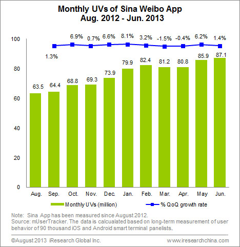 Despite having more than 500 million accounts, Weibo keeps growing fast. It’s achieved 54 million daily active users in June, up 8.3% from March. Baidu, on the other hand, isn't growing much after obtaining 80% of the whole search queries market.