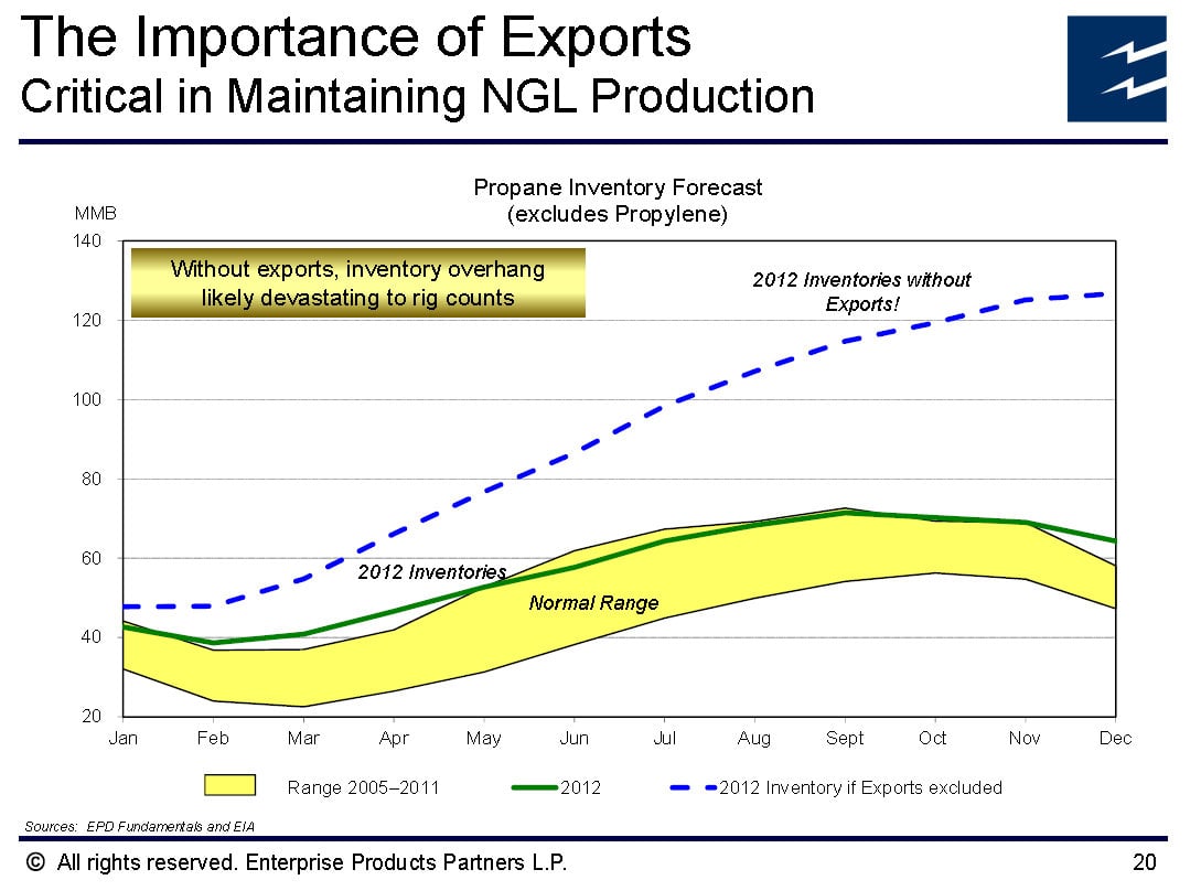What's key here is that without Enterprise's export capacity, U.S. natural gas producers would be in trouble. As the following chart shows, without exports last year the U.S. would be significantly oversupplied with propane.