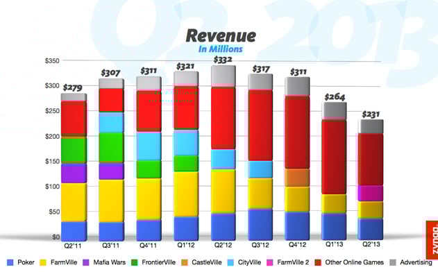 Nowadays, few people remember how important Zynga was for Facebook. In 2011, Zynga contributed to 12% of Facebook's total revenue. The picture is completely different this quarter. Fierce competition from King.com -- the developers behind Candy Crush -- and Asian gaming companies, combined with a shift to mobile devices, took the company's revenue from $332 million in the second quarter of 2012 to $231 million in the latest quarter. At the same time, the company keeps burning cash. It reported a net loss of $16 million last quarter.