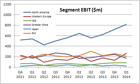 First, its mature markets are out-performing. A look at segmental earnings before interest and taxes (EBIT) reveals that growth this year has come from North America and Western Europe.