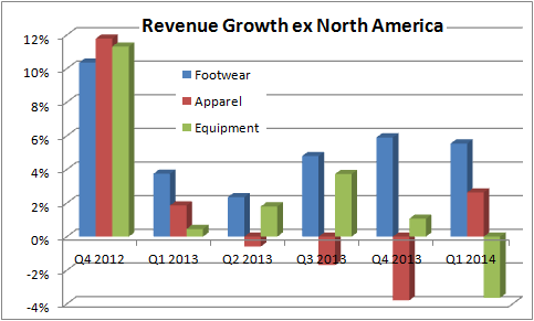 With regards to North America, apparel grew at the same 9% rate as footwear, and management declared itself "super excited" by the performance in its women's business. This is something that might concern yoga-gear maker Lululemon Athletica (LULU +3.49%). After suffering quality issues with its black yoga gear, Lululemon was susceptible to losing some market share. This sort of issue is critical for Lululemon, because it's positioned as a premium seller in the marketplace.