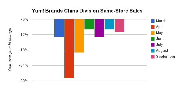 And up until Wednesday, that point remained intact, and the stock had risen nearly 12% from its low point in April. That was, at least, until the company reneged on that promise with its third-quarter earnings report, saying September same-store sales declined an estimated 11% in China. Specifically, that includes a 6% gain at Pizza Hut, and a stubborn 13% fall at KFC.