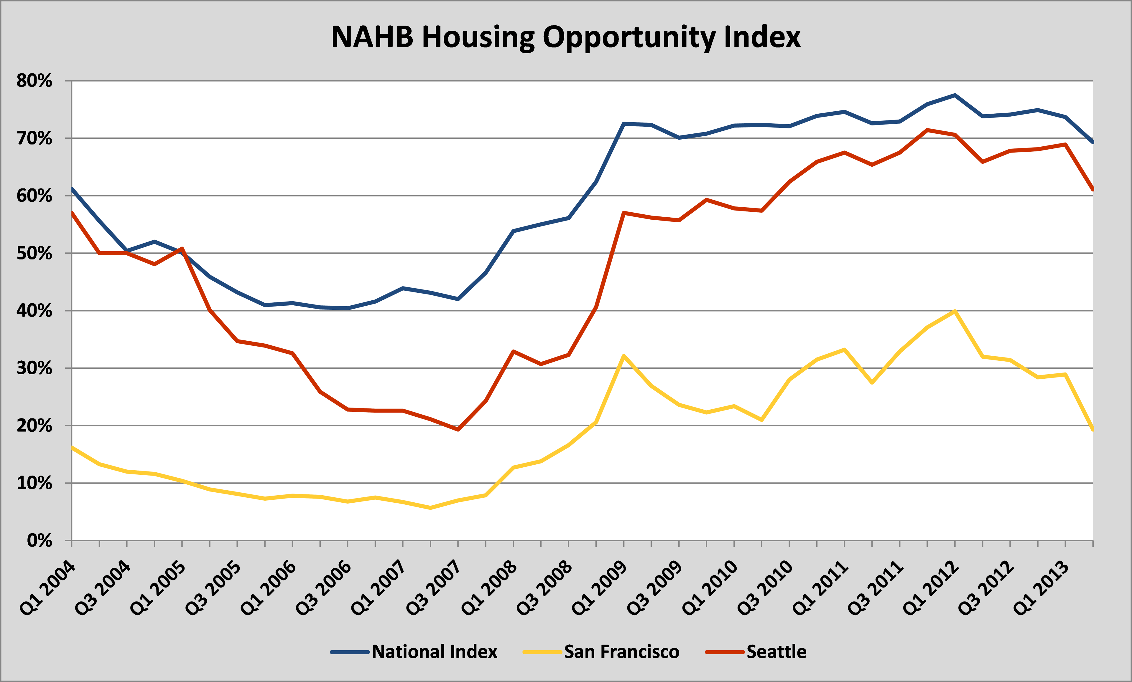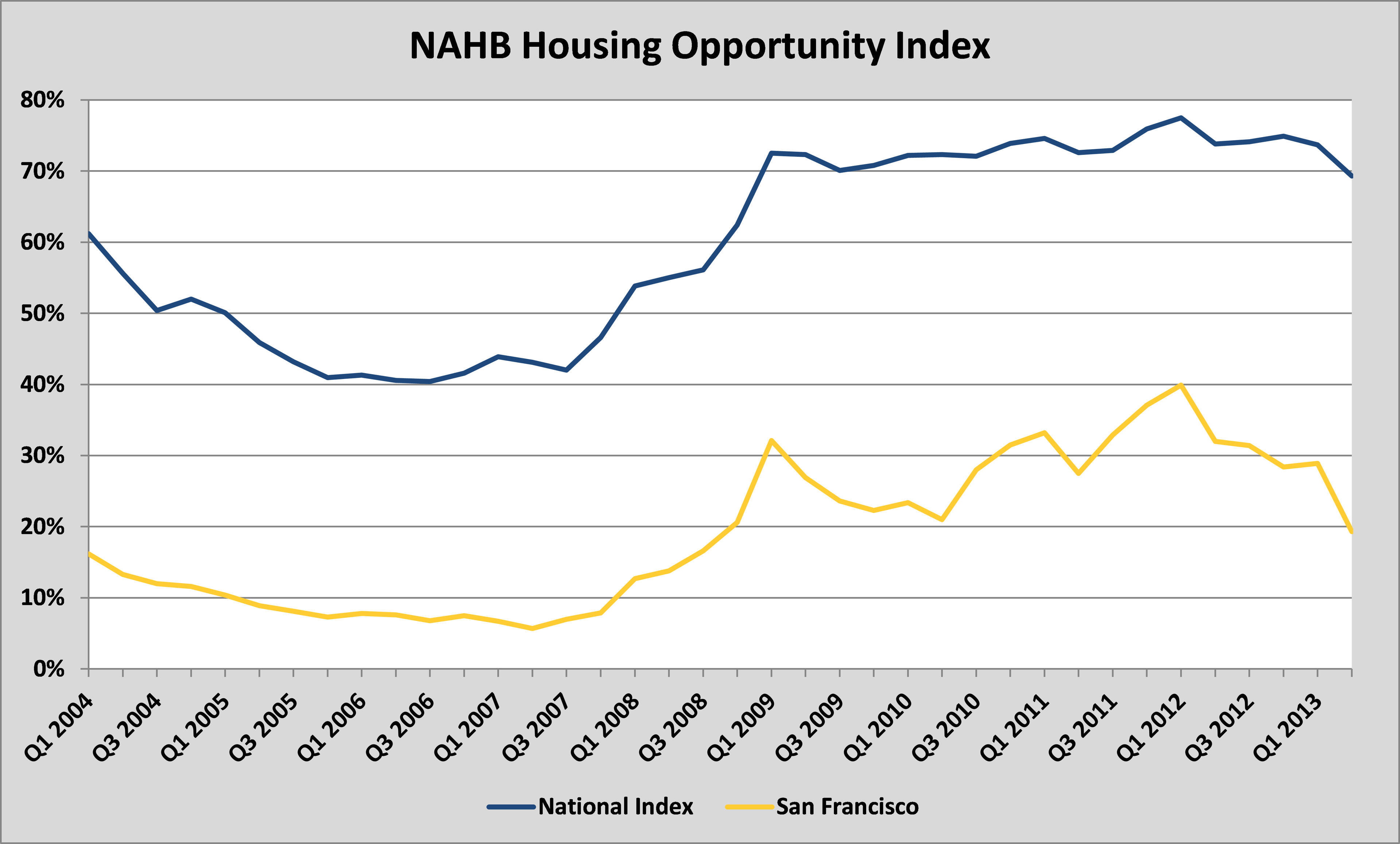 Each quarter, the National Association of Homebuilders (NAHB) and Wells Fargo release the Housing Opportunity Index (HOI) which attempts to measure what the most and least affordable housing markets in the United States are. San Francisco supplanted 18-time defending champion New York beginning in the fourth quarter of 2012 and has remained there ever since.
