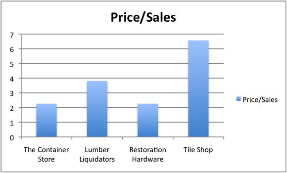 According to the chart above, we can actually see that the company is trading at a pretty cheap multiple of 2012 sales compared to its peers. While its price is in line with Restoration Hardware at 2.26 times sales, it's trading far lower than the 3.81 times sales that Lumber Liquidators is and the high 6.57 times sales that Tile Shop is trading for.