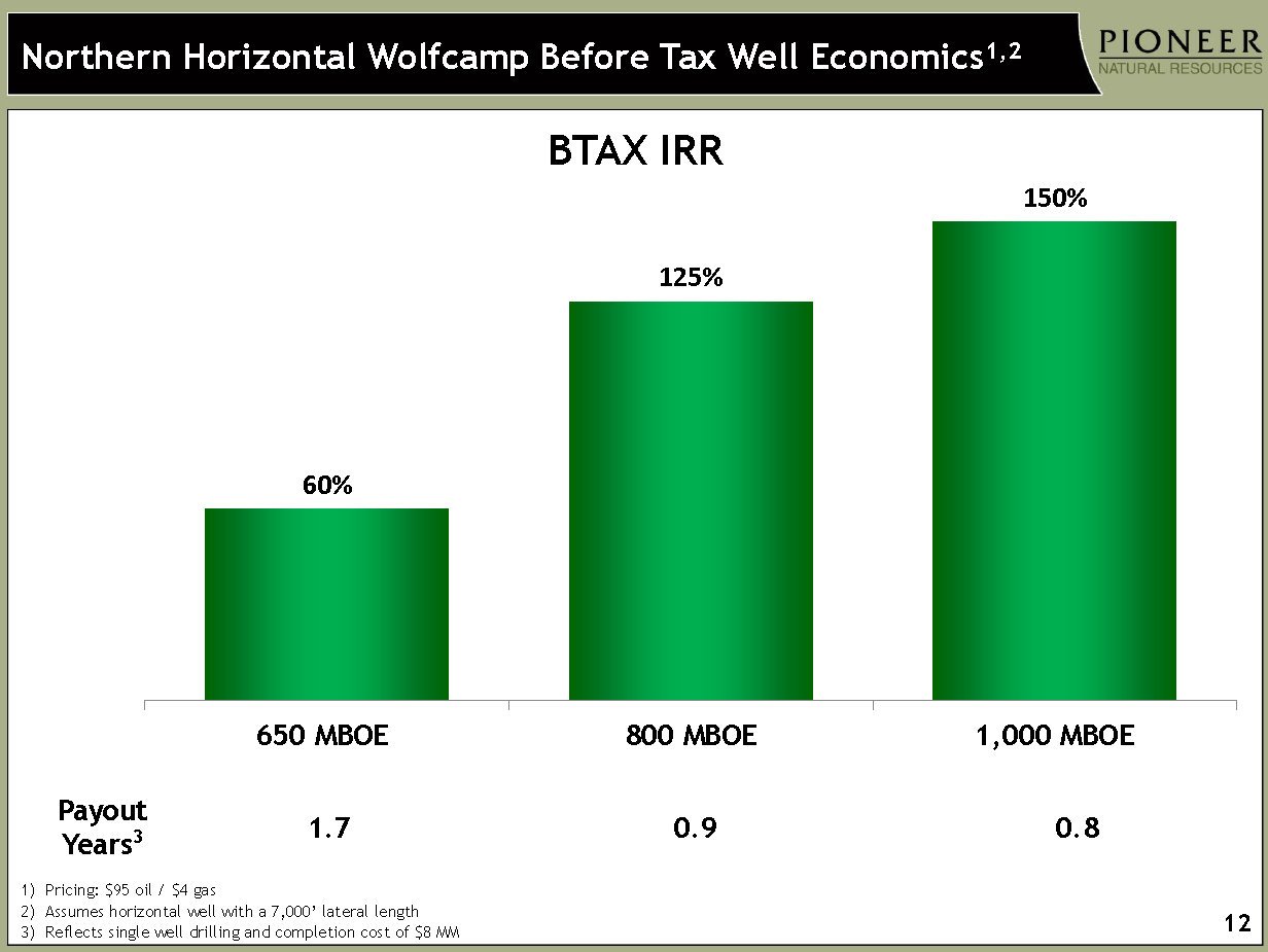 That's pretty significant because the economic returns of 1 million barrel of oil equivalent well can be more than 100%, depending on well costs, oil content, and commodity prices. Returns like those enable oil and gas companies to turn drilling rigs into money printing presses. As the following slide details, the more oil and gas that Pioneer's wells can produce, the higher the returns.