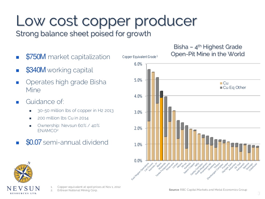 Nevsun Resources (NYSEMKT: NSU), in partnership with the Eritrean National Mining Company (ENAMCO), owns 60% of the Bisha Mine— Eritrea's first major international investment project. Milling at over 2% copper equivalent, Bisha is one of the highest grade open-pit copper mines in the world.