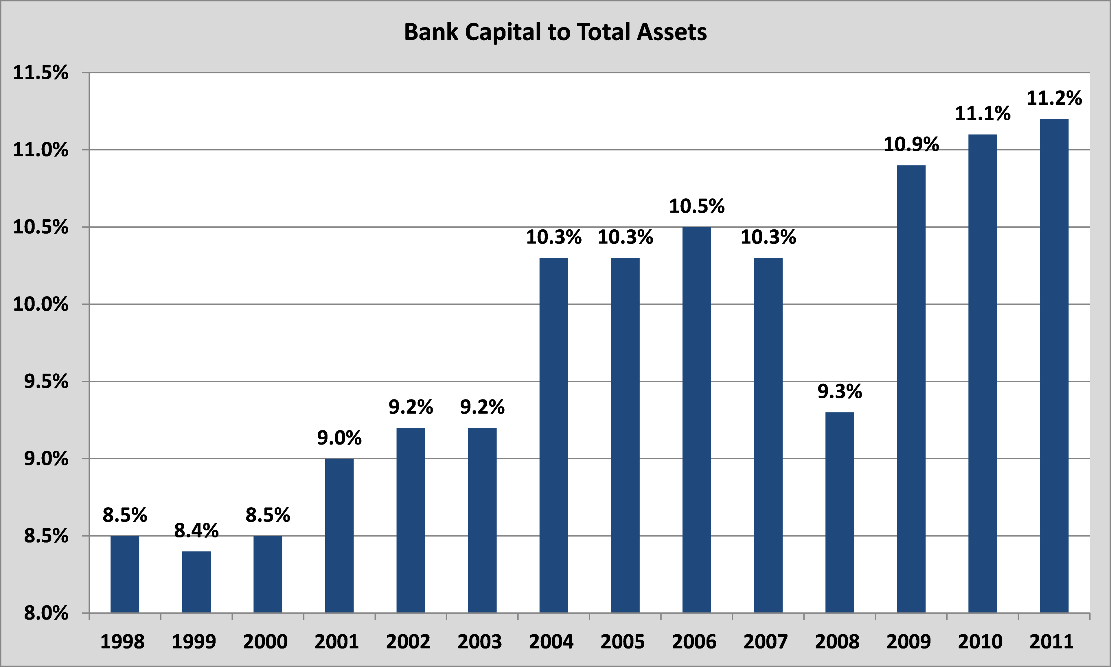 To their credit, the banks have made changes. Based on the most recent data from the World Bank, banks have been raising their capital balances (which will insulate against losses) in each successive year since 2008: