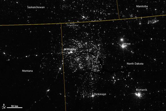 The above photo was taken from space. It shows what appears to be a scattering of cities in Northwest North Dakota. The only problem is that this part of North Dakota is among the least densely populated in the U.S. What NASA took a picture of was oil wells where the natural gas is being flared off.