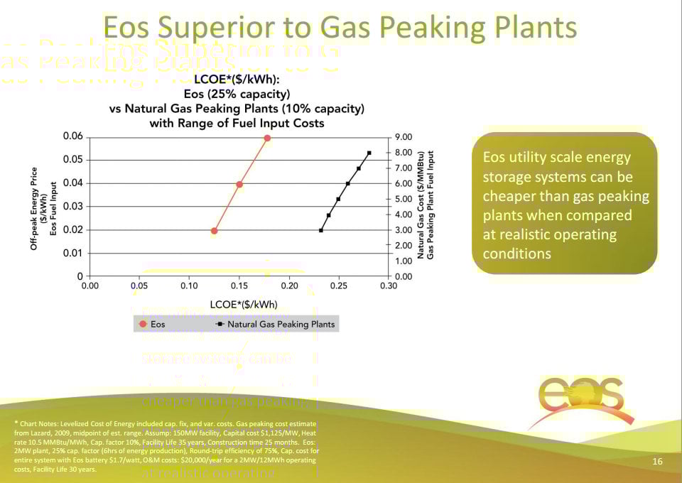 This will also reduce the need for additional natural gas-fired turbines that are traditionally needed to supply power during times of peak demand. As the following slide shows, an EOS system projects to be much cheaper than natural gas in supplying peak energy demand.