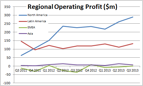 Clearly, it's a story of North America strengthening while the other regions are weakening. The good news is that Whirlpool generates most of its profit from North America anyway.