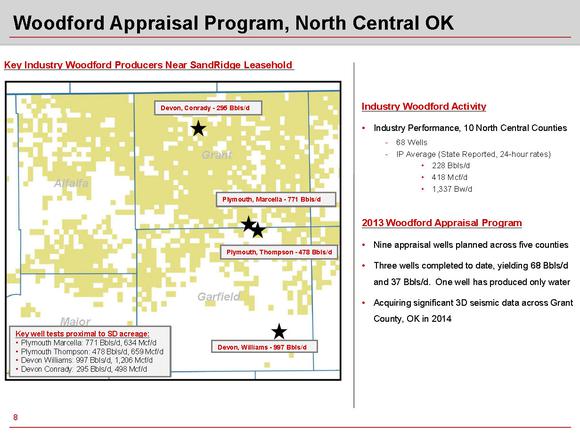 Another company to watch is Marathon Oil (MRO +0.00%). Though its operating to the south of SandRidge's position it is targeting the Woodford, as well as the Mississippian and Marmaton plays. So, while the initial results from SandRidge's first three Woodford wells were lousy, results like those from Devon Energy as well as the push from other producers like Marathon Oil, support the belief that there is Woodford potential within SandRidge's acreage.