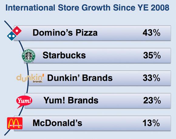Notice that the world's third-largest pizza company, Papa John's, is trying to capture market share from Domino's and Pizza Hut by differentiating its pizza with natural ingredients and by offering diversity in its topping options. With 80% of its locations in North America, the company has plenty of growth opportunities available in emerging markets where it is planning aggressive expansion. This expansion is being facilitated by reducing the investment needed to open a franchise restaurant to roughly $200,000.