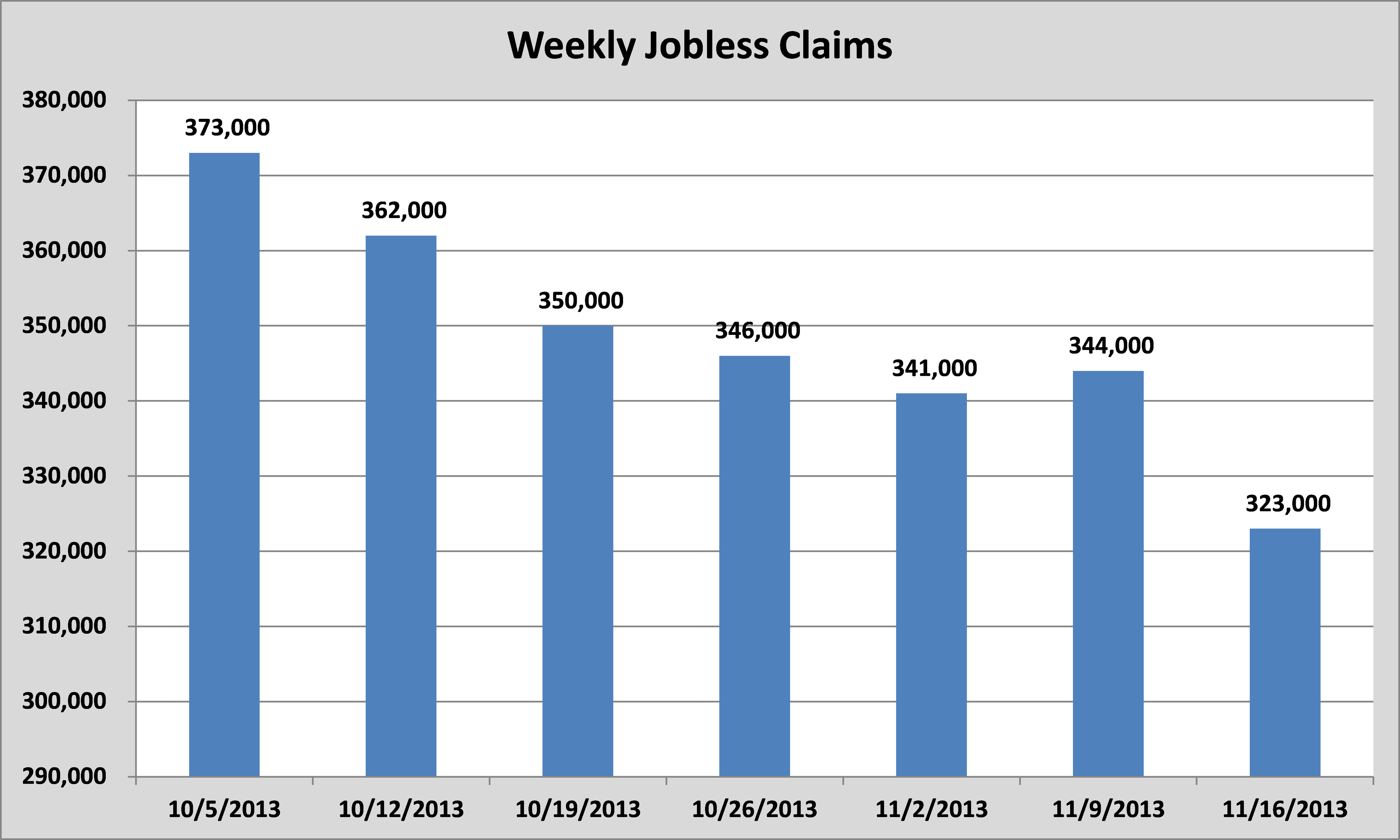 The Department of Labor announced today that initial jobless claims for the week ending Nov. 16 fell to a seasonally adjusted level of 323,000, a decrease of 21,000, or 6.1%, relative to the 344,000 reported the previous week. The latest number is the lowest since late September.