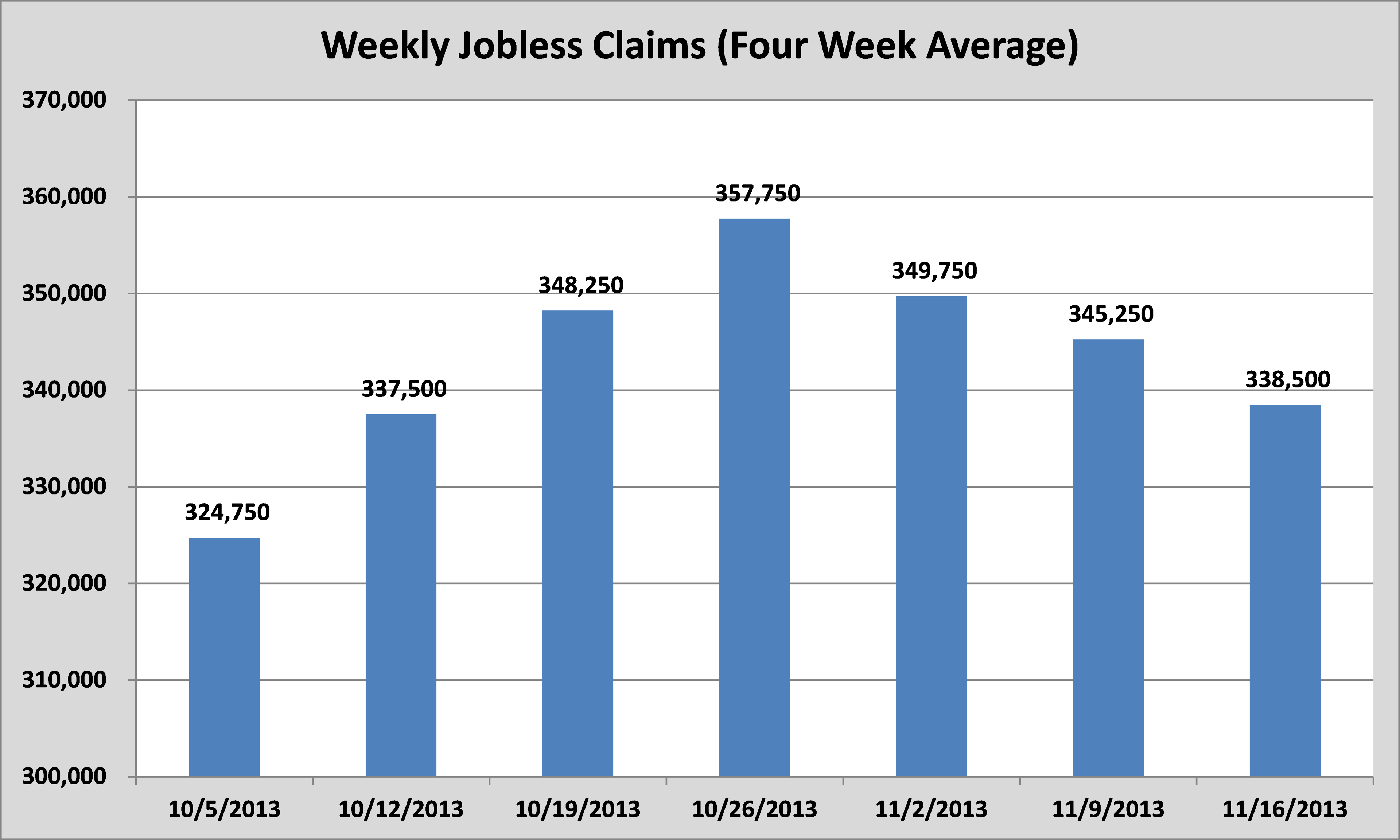 The four-week moving average for jobless claims also fell for the third week in a row to 338,500: