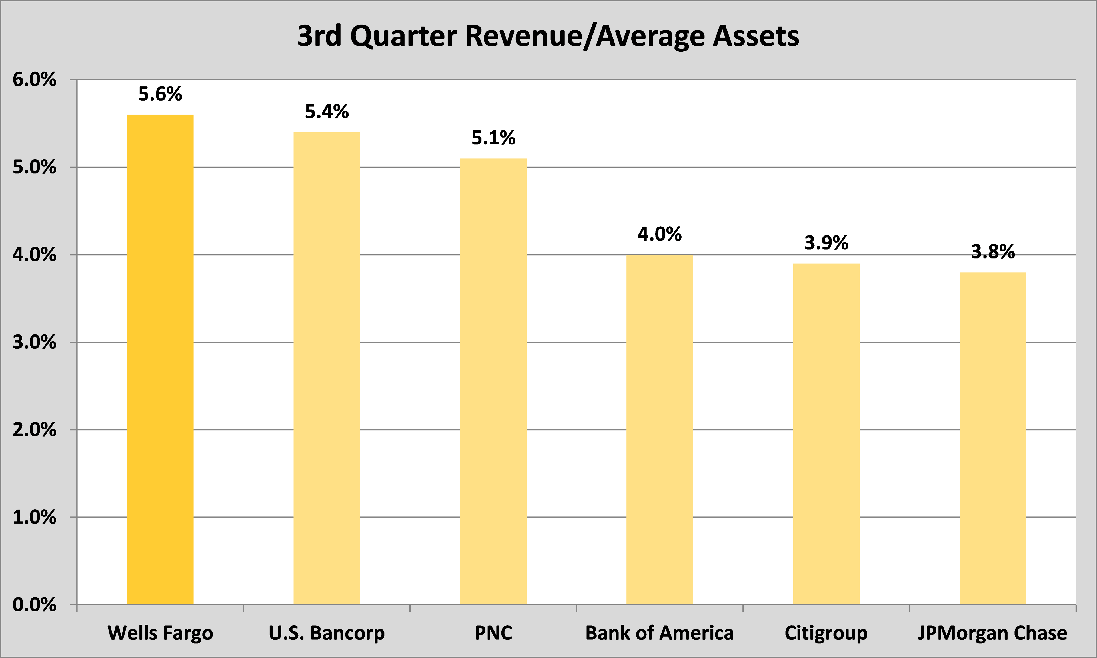 Even despite the significant decline in its revenue, Wells Fargo still led its peers in its ability to generate revenue from its available assets in the most recent quarter. This shows that Wells Fargo is not only among the industry leader in wringing out income from its assets, but also one of the key drivers behind that principally comes from its ability to bring in top line revenue.
