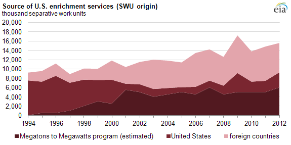 That's no small issue. That uranium generated "roughly half of all commercial nuclear energy produced domestically during that time." Although Russia, through intermediaries, will continue to be a source, the flow of the fuel into U.S. ports is set to fall dramatically in the near term and will only ramp up enough to provide for about half of the lost supply by 2015.