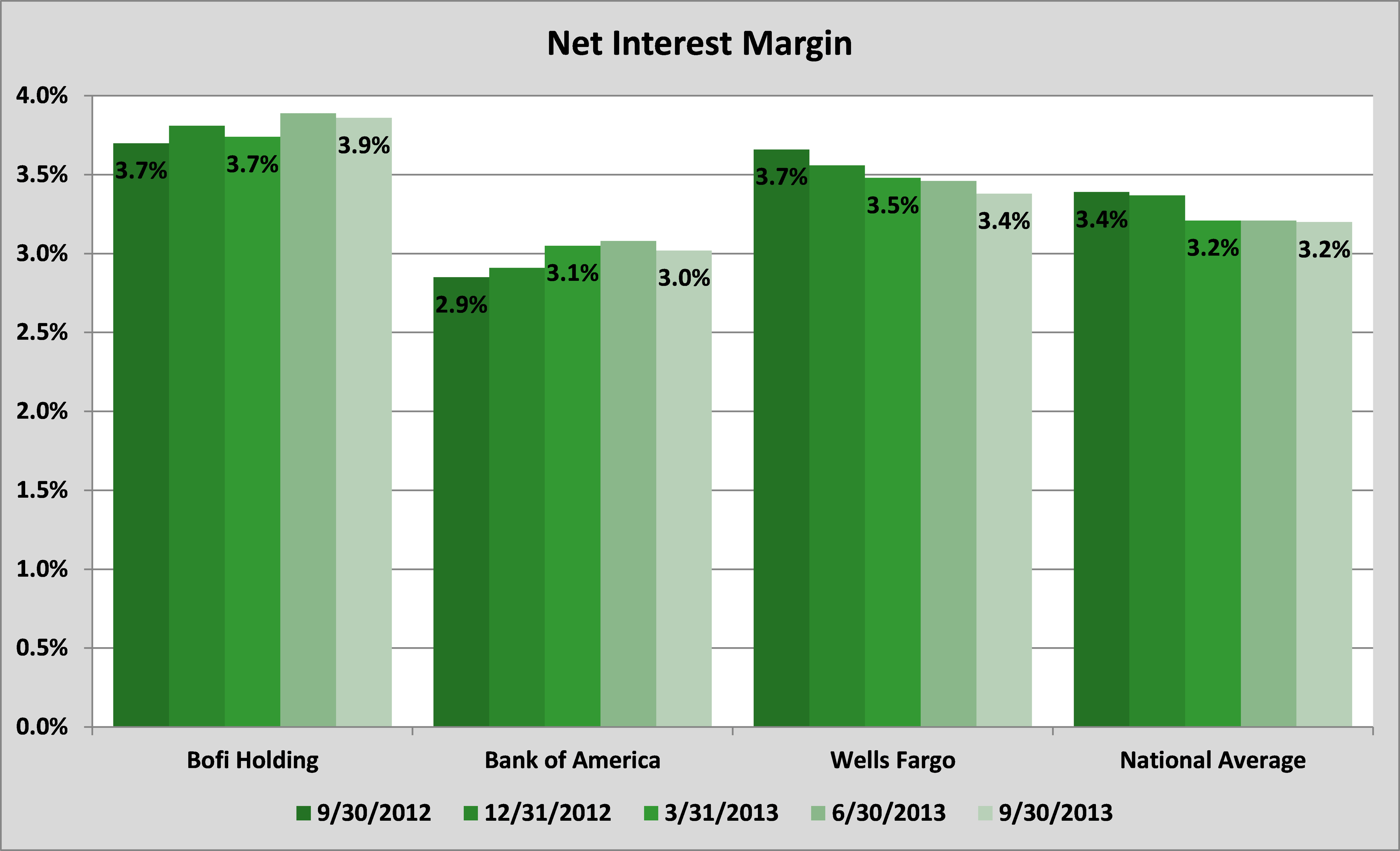 Next on the key banking metric list is net interest margin, which is the difference between what a bank earns on its loans compared to what it pays out on its deposits and other debt. BofI has long been able to outperform not only better-known banking peers like Bank of America (BAC +0.38%) and Wells Fargo (WFC +0.15%), but also the national average, as shown in the chart below. As a matter of fact, Wells Fargo has actually seen its net interest margin fall, but BofI has watched its rise: